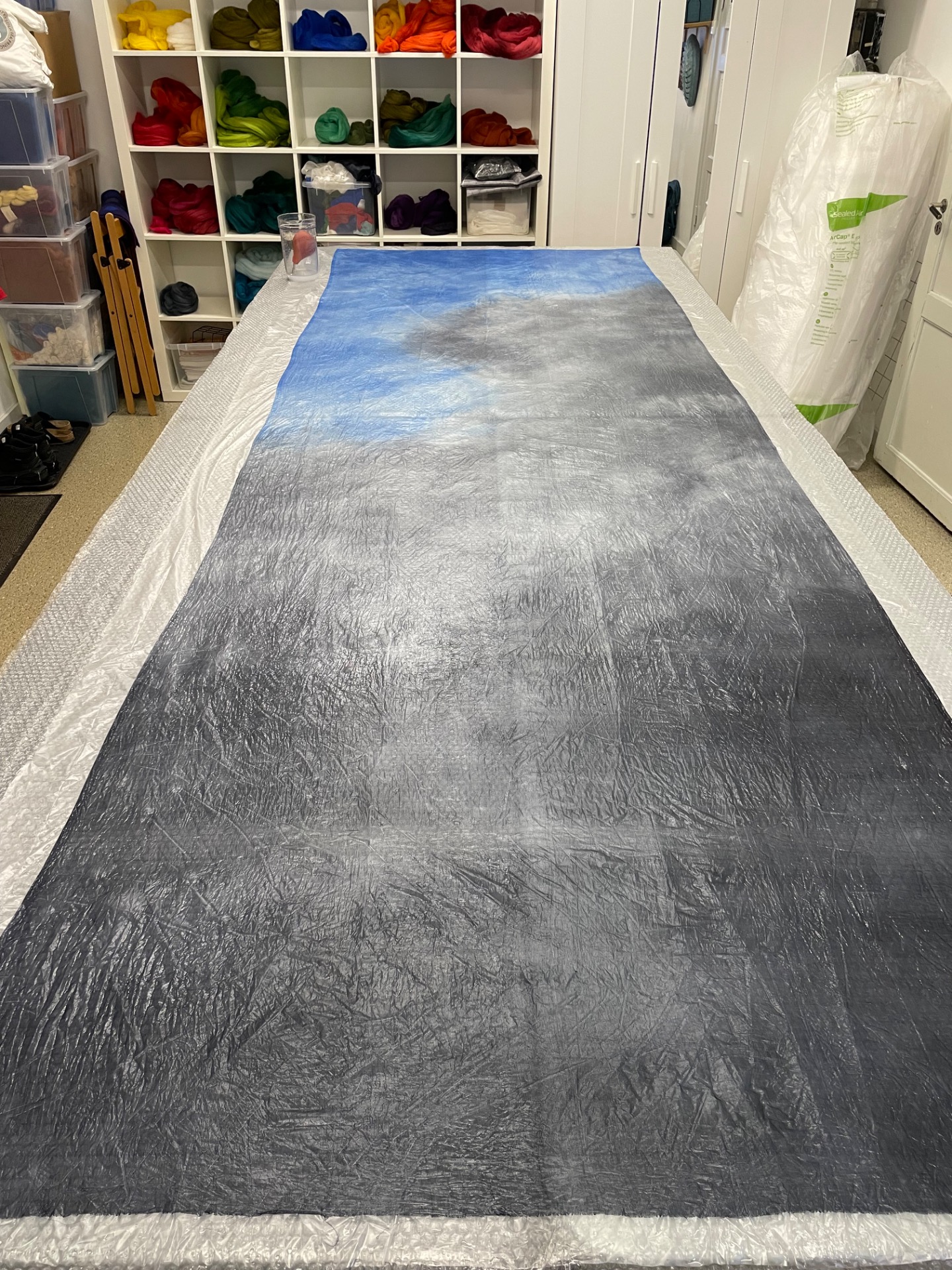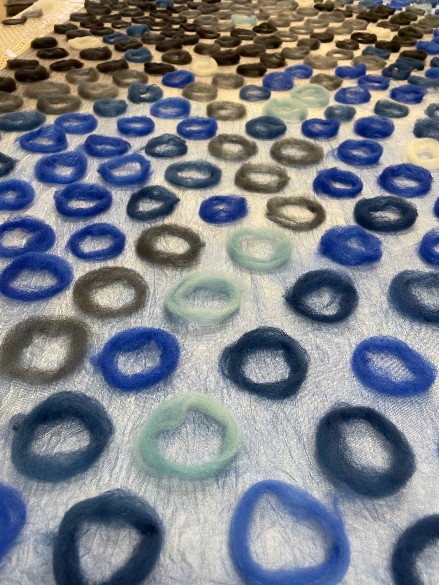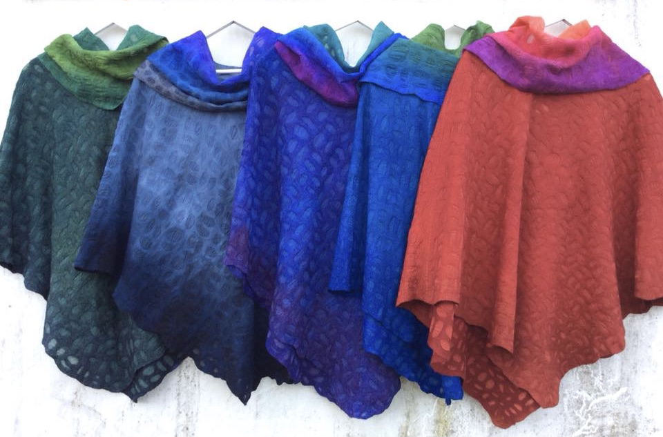er den vanligste kombinasjonen i nunofilt. Jeg tover bl.a. skjerf og ponchoer i en åpen "blondeteknikk" som gir lette, behagelige plagg. Produktene håndfarges.